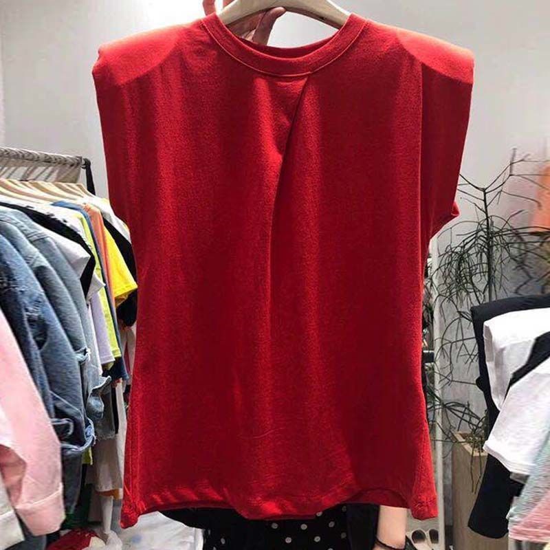 韩国东大门2022夏新款时尚垫肩背心女褶皱设计感圆领短袖T恤上衣热门设计联盟服务商