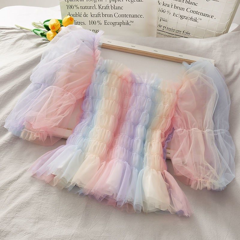 粉色泡泡袖雪纺衫女夏网纱收腰修身一字方领很仙的上衣设计感小众热门设计联盟服务商